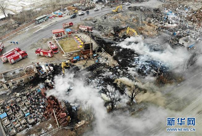 消防人员在事故现场进行灭火和清理工作(11月24日无人机拍摄)。新华社记者 林宏 摄