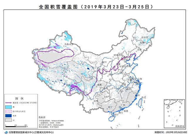 根据卫星遥感监测:3月23日至25日,霜冻线以北区域中黑龙江、四川、西藏、青海、新疆等5个省(自治区)315个县(市、区)积雪覆盖范围超过51.2万平方公里(不含冰川和永久积雪)。受今明两日降雪、降温和前期雪灾影响,青海省玉树藏族自治州曲麻莱县、治多县、扎多县、称多县和西藏那曲市巴青县、山南市洛扎县、日喀则市定日县等地部分地区存在牧区雪灾风险。