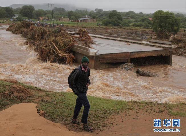 3月18日,在津巴布韦马尼卡兰省的奇马尼马尼,一座桥梁被洪水冲垮。 新华社发(肖恩·朱萨 摄)