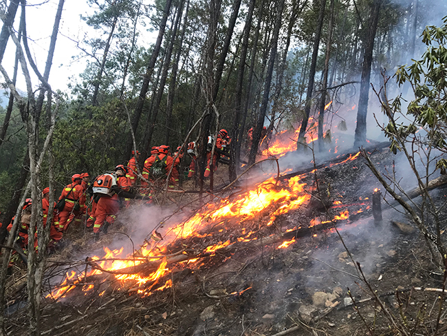 火场海拔2600米左右,地形复杂、山势陡峭,植被以云南松为主,火场周边有可用水源。根据勘查情况,前方指挥部决定采取以水灭火与常规灭火同步展开的方式进行扑救。 新华社发(李从林 摄)