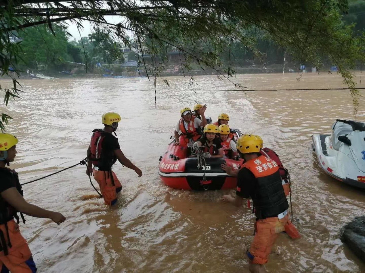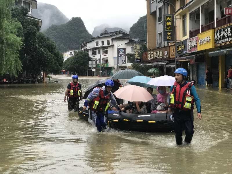 广东佛山菠萝救援服务中心派出7名队员连夜赶赴广西阳朔景区,对因降雨被困景区的游客进行转移。