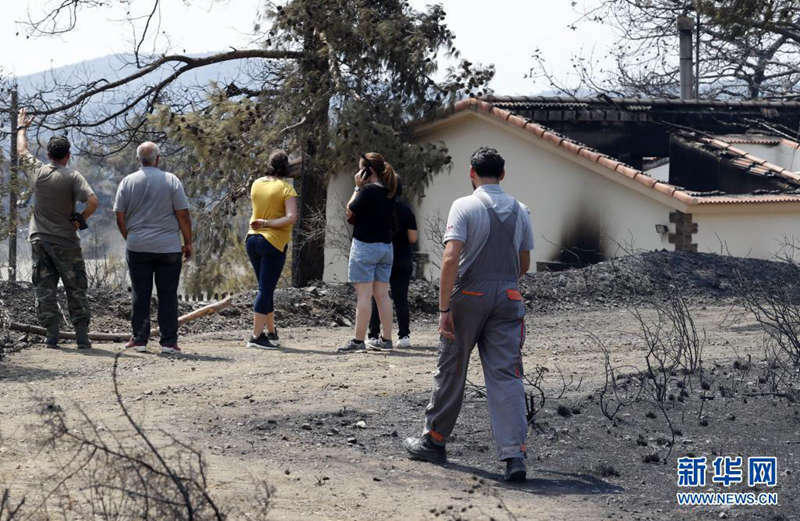 7月4日,人们聚集在塞浦路斯拉纳卡地区奥拉村被烧毁的民房周围。塞浦路斯警方4日表示,该国南部山区3日发生的山火已造成4人死亡,一些民房和车辆被烧毁。新华社发(乔治·克里斯托弗鲁摄)