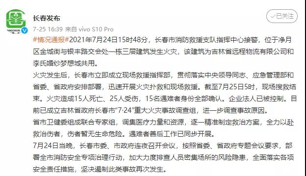 7月24日,长春市净月区金城街与银丰路交会处一栋三层建筑发生火灾,造成15人死亡、25人受伤。该建筑为吉林省远程物流有限公司和李氏婚纱梦想城共用。目前,事故原因正在调查中。