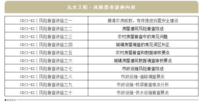 自2021年10月22日起,中国工程建设标准化协会抗震专业委员会微信公众号(CECS抗震专业委员会)将开设“九大工程·风险普查讲座”栏目,就“第一次全国自然灾害综合风险普查工作”中房屋建筑和市政设施普查的实施方案、普查内容与要点以及实施过程中的若干热点技术问题,由国务院普查办技术组住房和城乡建设部有关专家进行解读与评述,与广大技术人员共同探讨。欢迎大家将在实际工程遇到的问题,反馈给抗震专委会秘书处。