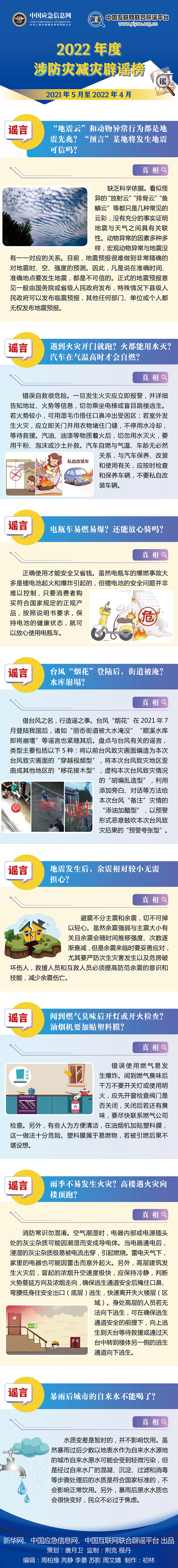 新华网、中国应急信息网、中国互联网联合辟谣平台共同发布“涉防灾减灾辟谣榜”,通过对2021年5月至2022年4月涉防灾减灾类谣言的盘点,梳理出《“地震云”和动物异常行为都是地震先兆?“预言”某地将发生地震可信吗?》《遇到火灾开门就跑?火都能用水灭?汽车在气温高时才会自燃?》《闻到燃气臭味后开灯或开火检查?油烟机要加贴塑料膜?》《暴雨后城市的自来水不能喝了?》等8大防灾减灾类典型谣言,涉及地震、火灾、极端天气等相关方面的内容。“辟谣榜”旨在澄清谬误,传递真知,提升全民安全意识,构筑防灾减灾的“科学堡垒”,构建抗灾救灾的“群众长城”,正确应对灾害,守护美好家园。