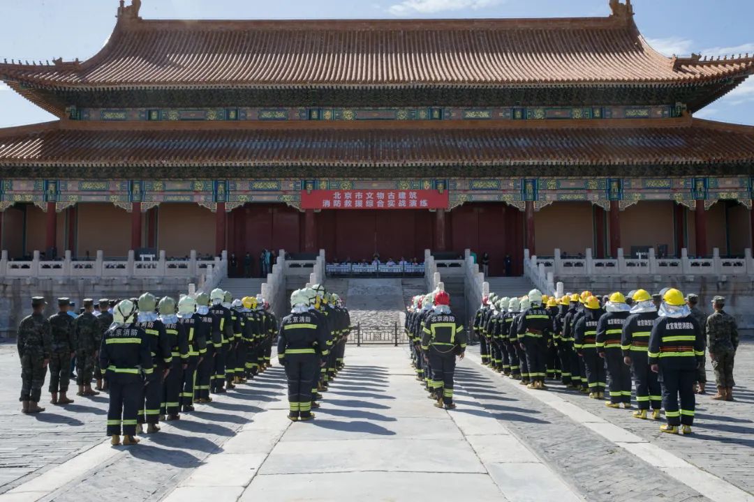 19日上午,北京消防在故宫博物院举行北京市文物古建筑消防救援综合实战演练。