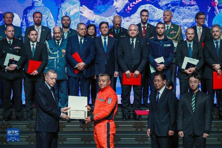 4月25日,在土耳其安卡拉,土耳其总统埃尔多安(前左一)向中国救援队副队长王墨(前左二)颁发奖章。新华社发(穆斯塔法·卡亚 摄)