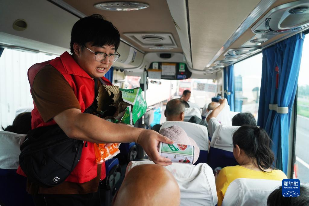 8月2日,在北京市房山区的京港澳高速琉璃河出口,志愿者在转运车辆上向受灾群众发放食品。
