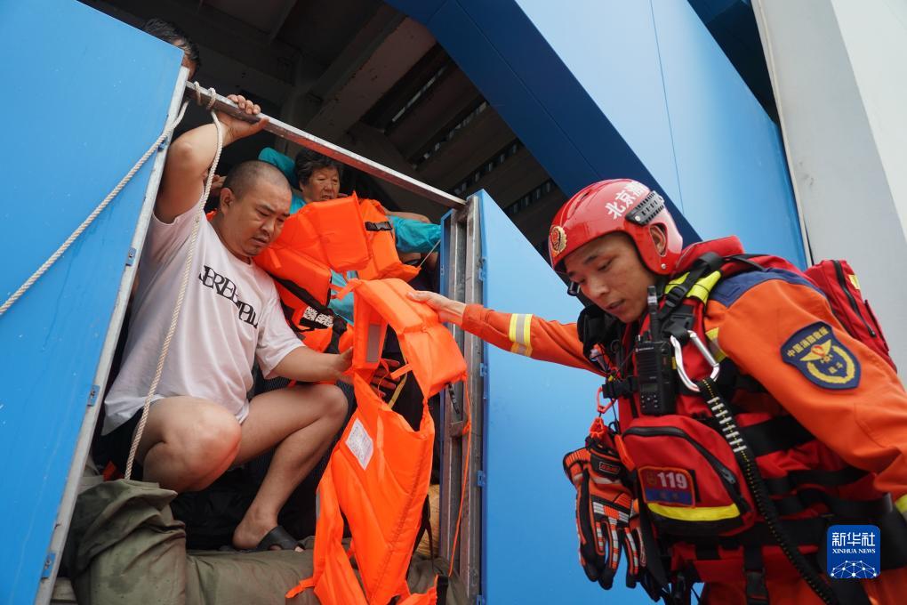 8月2日,在北京市房山区琉璃河镇平各庄村,消防员向受灾群众递救生衣。
