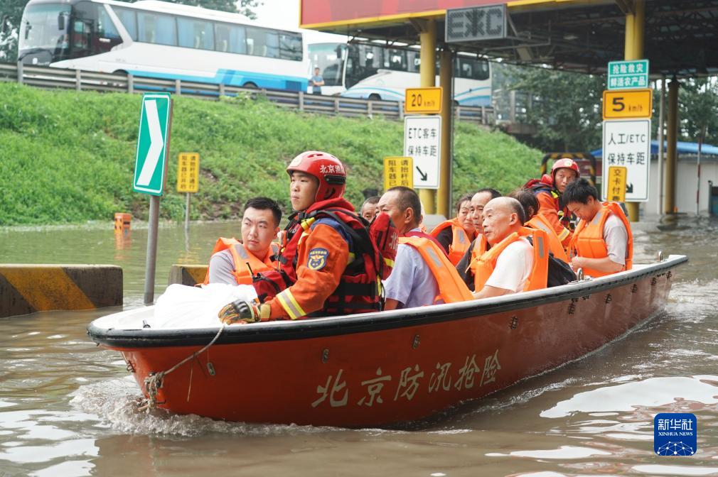 近日,受持续强降雨影响,北京市房山区部分区域发生山洪灾害。8月2日,由消防员、医护人员、志愿者等组成的救援力量有序转运琉璃河镇平各庄村的受灾群众。