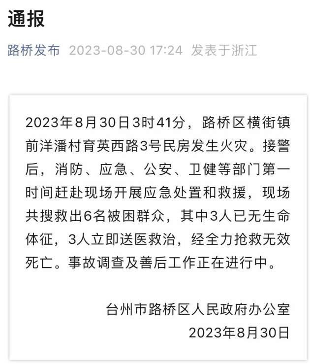 8月30日3时41分,浙江省台州市路桥区横街镇一民房发生火灾,现场共搜救出6名被困群众。其中3人已无生命体征,3人立即送医救治,经全力抢救无效死亡。事故调查及善后工作正在进行中。