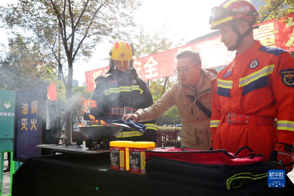 11月13日,市民(中)在消防员指导下进行厨房油锅灭火体验。