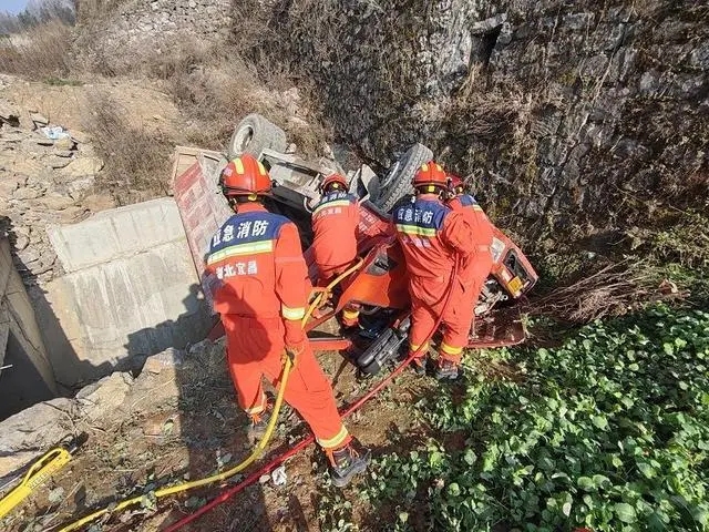 12月30日下午,湖北省宜昌市兴山县黄粮镇熊家坡附近一货车因刹车失控,撞向路边围栏导致车辆侧翻,一名驾驶员双腿被卡,一只腿骨折无法脱身,情况十分危急。