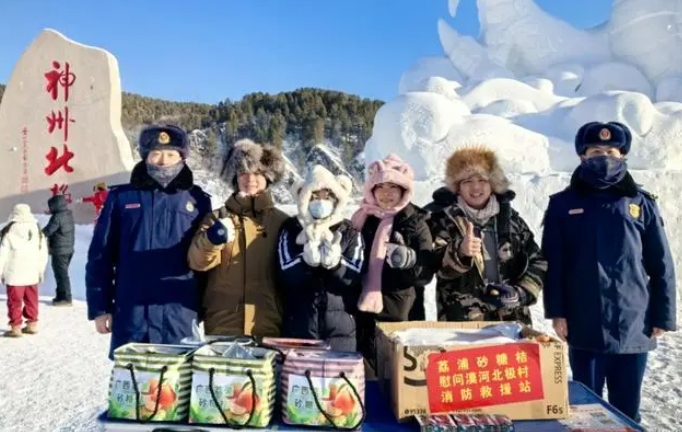 近日,来自广西荔浦的砂糖橘送达黑龙江漠河北极村消防救援站。1月8日,消防员们将部分砂糖橘送往北极村60岁以上的帮扶老人家中,同时在神州北极广场开展“百万志愿者联盟”活动并普及消防知识。