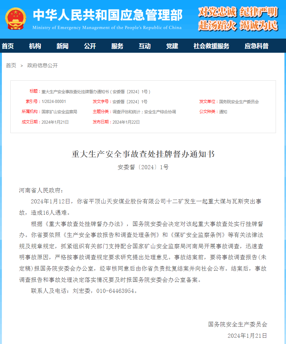 2024年1月12日,你省平顶山天安煤业股份有限公司十二矿发生一起重大煤与瓦斯突出事故,造成16人遇难。