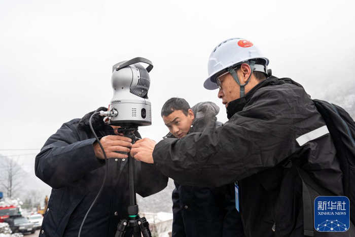 1月24日,国家隧道应急救援中铁二局昆明队中队长熊丹(中)在救援现场的便携式边坡雷达与轨道式边坡雷达阵地工作。新华社记者 江文耀 摄