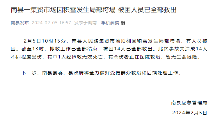 2月5日10时15分,湖南益阳南县人民路集贸市场顶棚因积雪发生局部垮塌,有人员被困。截至13时,搜救工作已全部结束,被困14人已全部救出。此次事故共造成14人不同程度受伤,其中1人经抢救无效死亡,其余伤者正在医院救治,暂无生命危险。