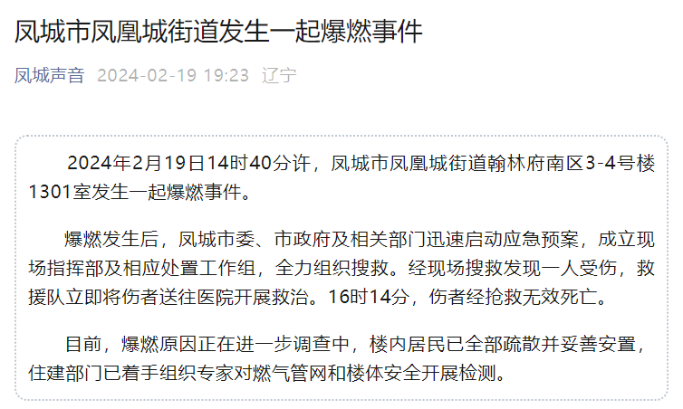 2024年2月19日14时40分许,辽宁凤城市凤凰城街道翰林府南区3-4号楼1301室发生一起爆燃事件。